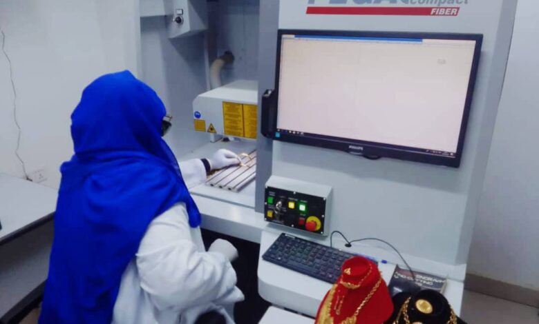 تأكيداً لدور الھيئة السودانية للمواصفات والمقاييس المھم فى عملية الرقابة على الذھب وضمان مطابقتھا للمعايير الدولية أوضح الدكتور أحمد سيد أحمد عمر مدير قطاع الھيئة بنھر النيل أن القطاع قام بفحص وختم طن ونصف من الذھب و المشغولات المحلية فى الستة أشھر الماضية وقال د. أحمد أن قسم دمغ المصوغات يقوم بالدور الرقابي على المعادن النفيسة وفقا لقانون لمعادن النفيسة والأحجار الكريمة لتحديد العيارات للمعادن النفيسة من ذھب وفضة والختم للانتاج المحلي من سبائك ومشغولات وأن عملية التحليل تتم عبر جھاز (XRF) الاشعة السينية والطريقة الكيميائية والختم يتم بجھاز الليزر والختم اليدوي.