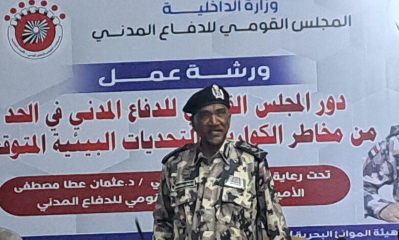 خلال مخاطبته ورشة دور المجلس القومي للدفاع المدني في الحد من مخاطر الكوارث الامين العام للدفاع المدني : تسببت الحرب في تدهور البيئة بالولايات مما استوجب تدخل الدفاع المدني لازالة المخاطر