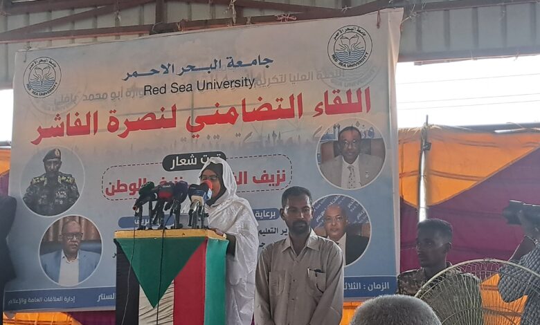 وخاطبت عضو مجلس السيادة دكتورة نوارة محمد محمد طاهر اللقاء التضامني لنصرة الفاشر تحت شعار نزيف الفاشر ..نزيف الوطن معلنة التضامن مع اهل الفاشر واكدت ان الدولة ستبذل كل جهد لاغاثة المتضررين واستعادة الفاشر وعودتها لحضن الوطن رمزا للصمود وعنوانا للكرامة والانسانية وقطعت نوارة بان النصر قادم تحت ظل جيش موحد وقيادة موحدة واكدت عضو مجلس السيادة وجود ثوابت وطنية لايمكن المساس بها وهي حماية المدنيين وضمان وصول المساعدات الانسانية والاغاثية لمستحقيها دون عوائق فضلا عن توثيق كل الانتهاكات لضمان تحقيق العدالة وعدم الافلات من العقاب وقالت نوارة ان وحدة واستقرار السودان خط احمر مشيرة لمحاولات فصل دارفور وقطعت ان السودان لن يتجزأ وعصيا على الانقسام والفتنة .