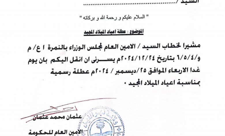 اعلنت ولاية نهر النيل غدا الاربعاء عطلة اعياد الميلاد المجيد وذلك حسب توجيهات مجلس الوزراء في جميع انحاء البلاد بشان العطلات والمناسبات الديتية على ان يصدر محافظ بنك السودان منشورا لتنظيم العمل في القطاع المصرفي اثناء العطلة .