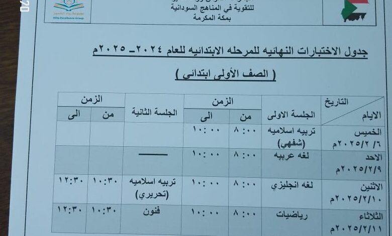 اعلنت مجموعة مدارس رواد التميز للتقوية في المناهج السودانية بمكة المكرمة بدء الاختبارات النهائية للمرحلة الابتدائية للعام 2024- 2025 للصفوف الأول والثاني والثالث ابتدائي غد الخميس الموافق السادس من فبراير ويجلس تلاميذ الصف الأول ابتدائي وفقا للجدول لمادة التربية الاسلامية (شفهي) الجلسة الأولى