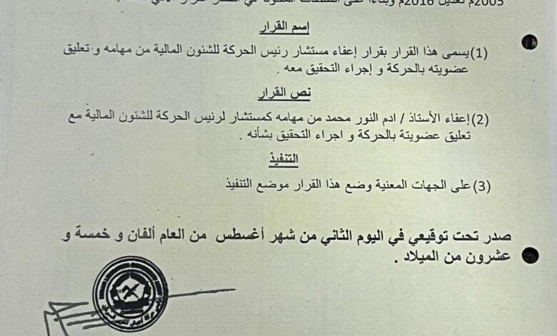اصدر رئيس حركة جيش تحرير السودان القائد مني اركو مناوي قرارات باعفاء 3مستشارين للحركة واحالتهم للتحقيق وهم مستشار الحركة للشئون المالية آدم النور محمد ومساعد الحركة للشئون القانونية محمد محمود كورينا واعفاء المستشار الاعلامي مصطفى عبد الله ابكر ( الجميل) وتعليق عضويته.