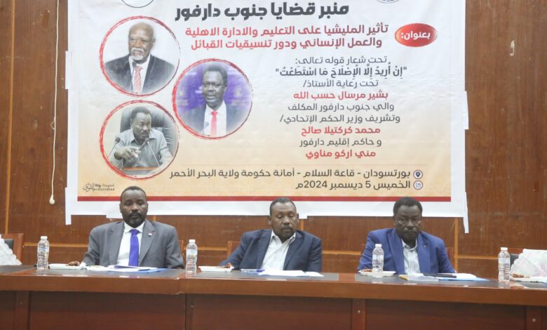 تحت شعار قوله تعالي ( ان اريد الا الاصلاح ما استطعت ) برعاية الاستاذ بشير مرسال حسب الله والي جنوب دارفور المكلف وتشريف وزير الحكم الاتحادي محمد كركتيلا صالح وحاكم اقليم دارفور مني اركو مناوي انطلق بمدينة بورسودان بقاعة السلام بامانة حكومة ولاية البحر الاحمر منبر قضايا جنوب دارفور الذي شرفه بالحضور عدد من الدستوريين والاعلامييين.