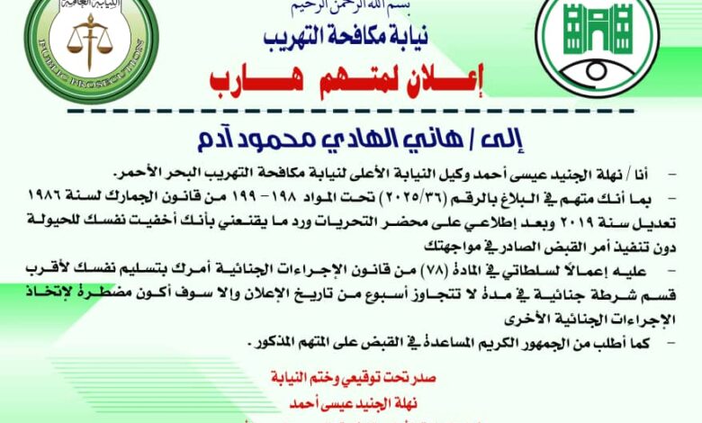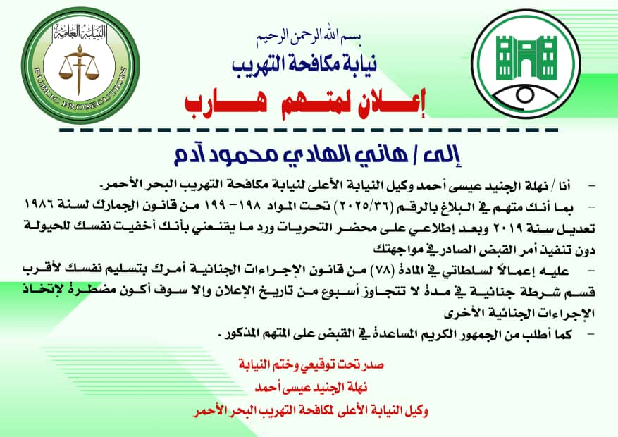 نيابة مكافحة التهريب إعلان لمتهم هارب/ إلي/المنذر سر الختم عوض صالح
