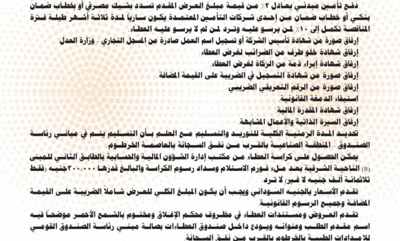 للاستفسار أثناء ساعات العمل الرسمية يمكن الاتصال على الرقم 00249912411849 أو زيارتنا في مباني رئاسة الصندوق بالخرطوم وآخر يوم لتلقي الاستفسارات هو يوم الأربعاء الموافق 06/05/2026م.