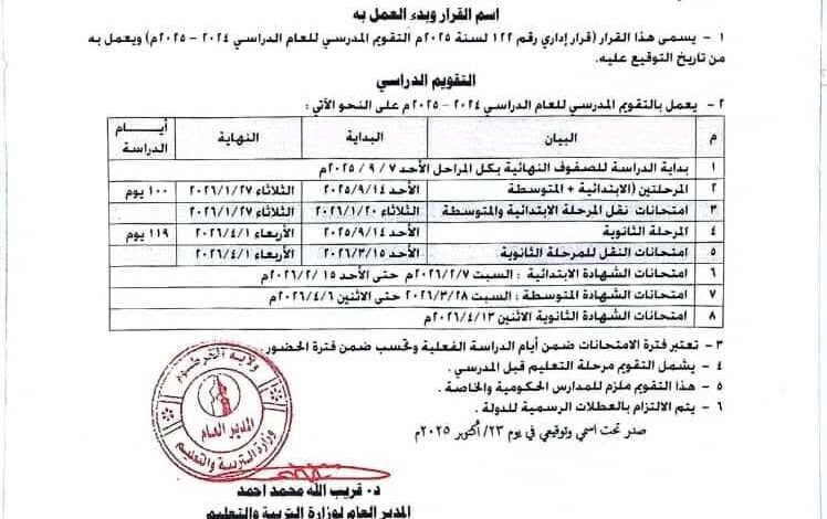 وحدد الاحد السابع من سبتمبر موعدا لبداية الدراسة الصفوف النهائية بكل المراحل على ان تكون البداية للمرحلتين الابتدائية والمتوسطة الاحد 2025/9/14 والنهاية الثلاثاء 2026/1/27 وامتحانات نقل المرحله الابتدائية والمتوسطه الثلاثاء 2026/1/20