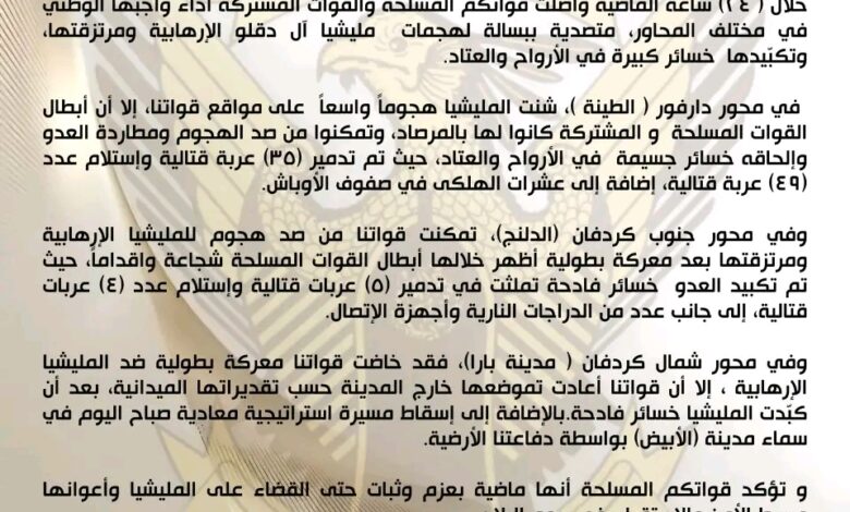 بسم الله الرحمن الرحيم القيادة العامة للقوات المسلحة بيان الثلاثاء ١٧ مارس ٢٠٢٦م شعبنا الأصيل .. خلال ( ٢٤) ساعة…