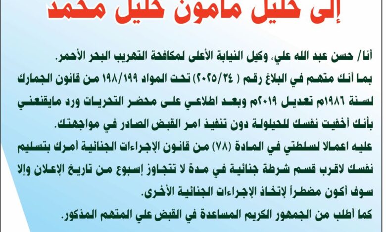جمهورية السودان النيابة العامة رئاسة النيابات المتخصصة نيابة مكافحة التهريب البحر الأحمر إعلان متهم هارب إلى…